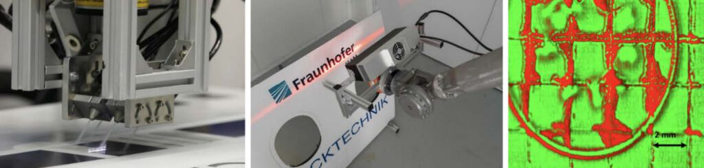 Left: Unregulated laser ablation using an IR laser. Center and right: Prototype HSI camera used by a robot to scan surfaces so that grid cuts can be analysed. © Fraunhofer IFAM