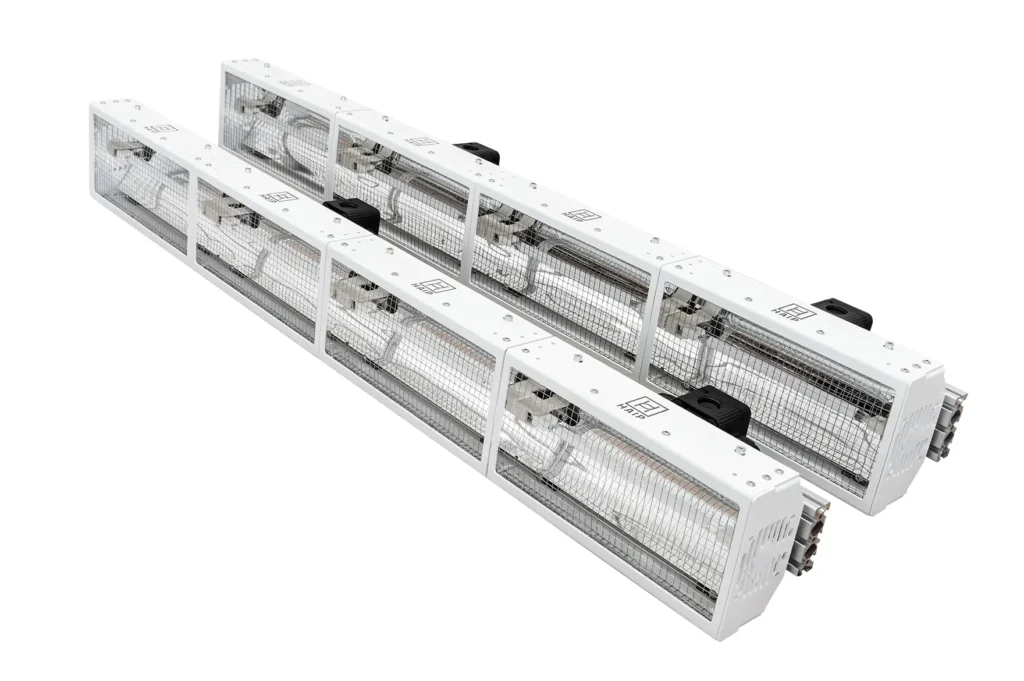 BlackBright FMWIR illumination modules use a dual-stage reflector concept to maximise optical efficiency. Each emitter integrates a unilateral ceramic reflector coating that directs radiation towards the inspection area. Additional external silver coated reflectors further shape and concentrate the emitted radiation into the narrow illumination line.